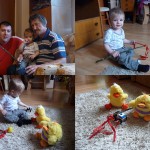 11. měsíc jsme ‚oslavili‘ zase bez táty. Nebyl na služebce, tentokrát jsme odjeli my na dva týdny na Slovensko. Zažili jsme tam Kubíkovy první Velikonoce. A vzhledem k tomu, že Kubík čokoládové vajíčka ještě nemůže, tak od babičky dostal plyšovou kačenku a od strejdy Pala dostal na památku na jeho první Velikonoce plyšové kuřátko.