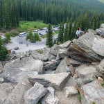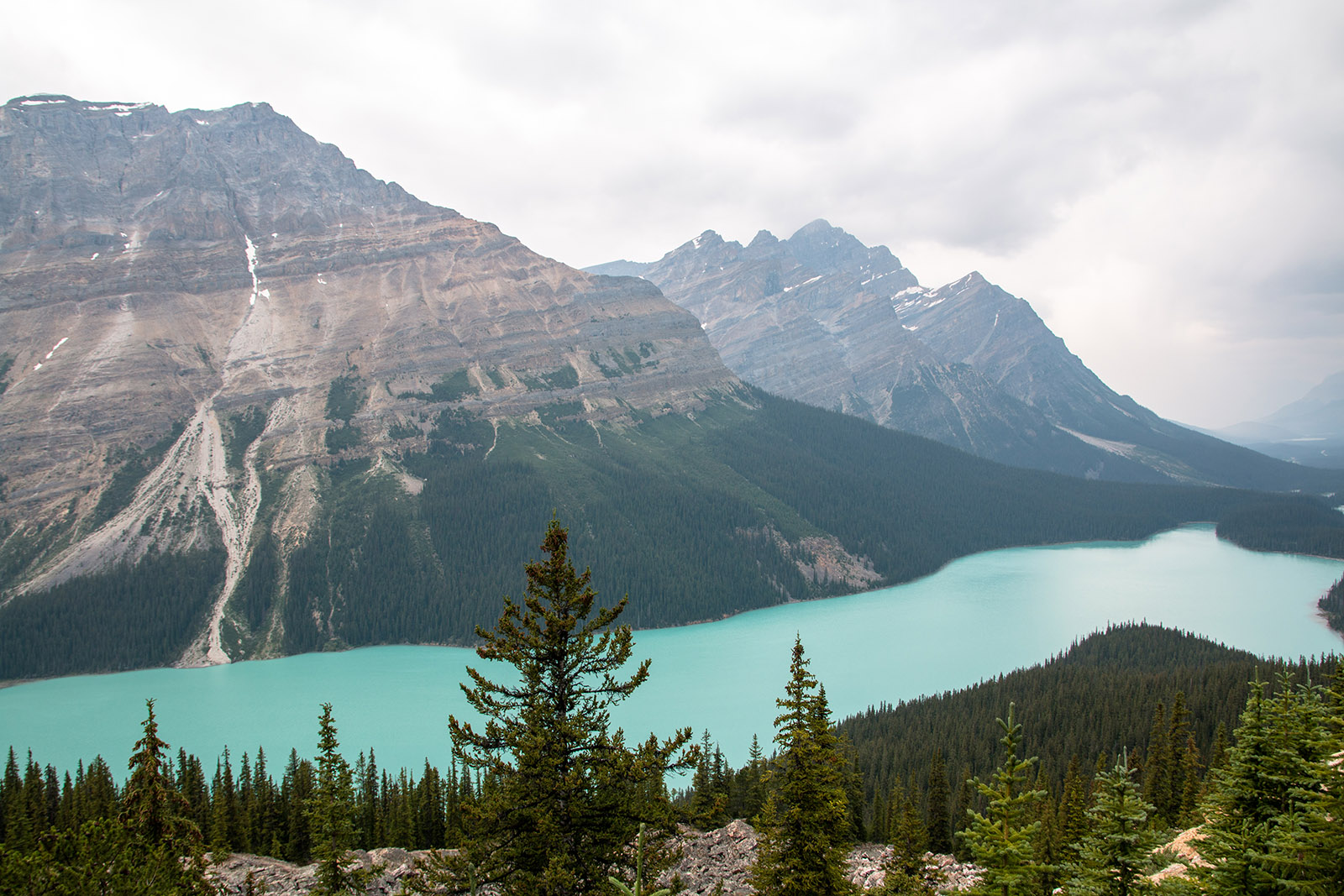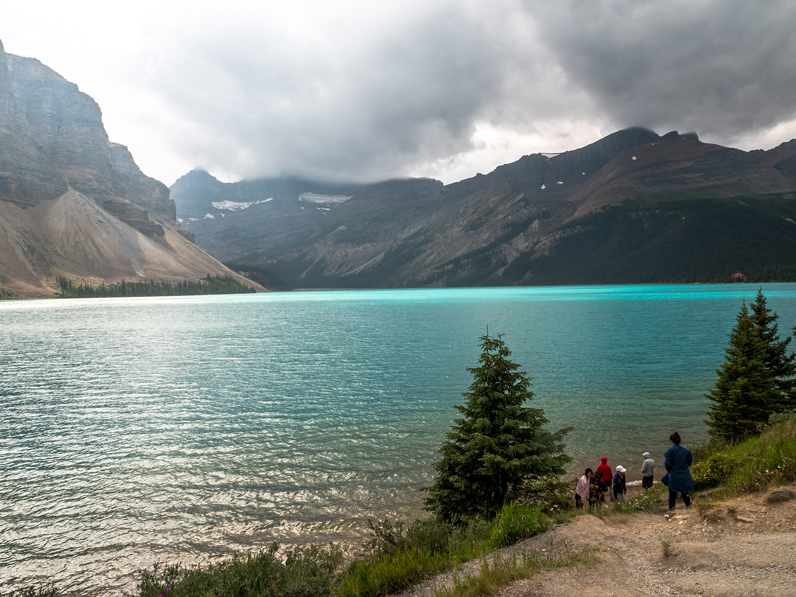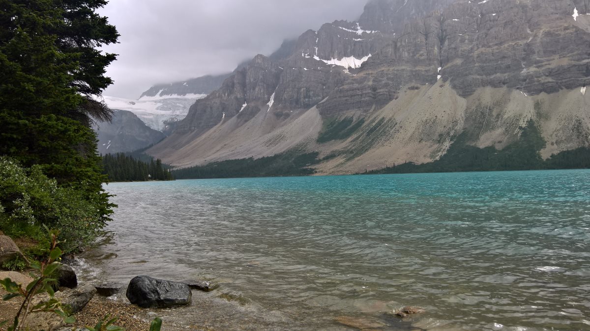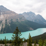 A od Trevora jsme se jeli podívat na 2 jezera (Peyto Lake a Bow Lake) Když jsme odcházeli od prvního jezera, tak začalo pršet. Než jsme dojeli k druhému, tak přestalo pršet a tak jsme se šli na něj podívat. Brzy začalo mrholit a tak jsme raději vyrazili na cestu z Banff NP do hotelu (16:00). Cestou do Revelstoke, stát British Columbia byly samé kolony (a všudypřítomný kouř z požárů), takže jsme na hotel dorazili až ve 21:00 (tam jsme se dozvěděli, že je tak kouřmo proto, že den předtím uhodil blesk a v okolí hoří). V autě se oba dva prospali. British Columbia je už jiné časové pásmo, takže tam bylo 20:00, což se nám hodilo. I tak jsme šli spát až ve 23hod tamního času a v té době začala pořádná bouřka a déšť. Další den ráno už nebyl cítit kouř z lesů, liják jistě pomohl hasit.