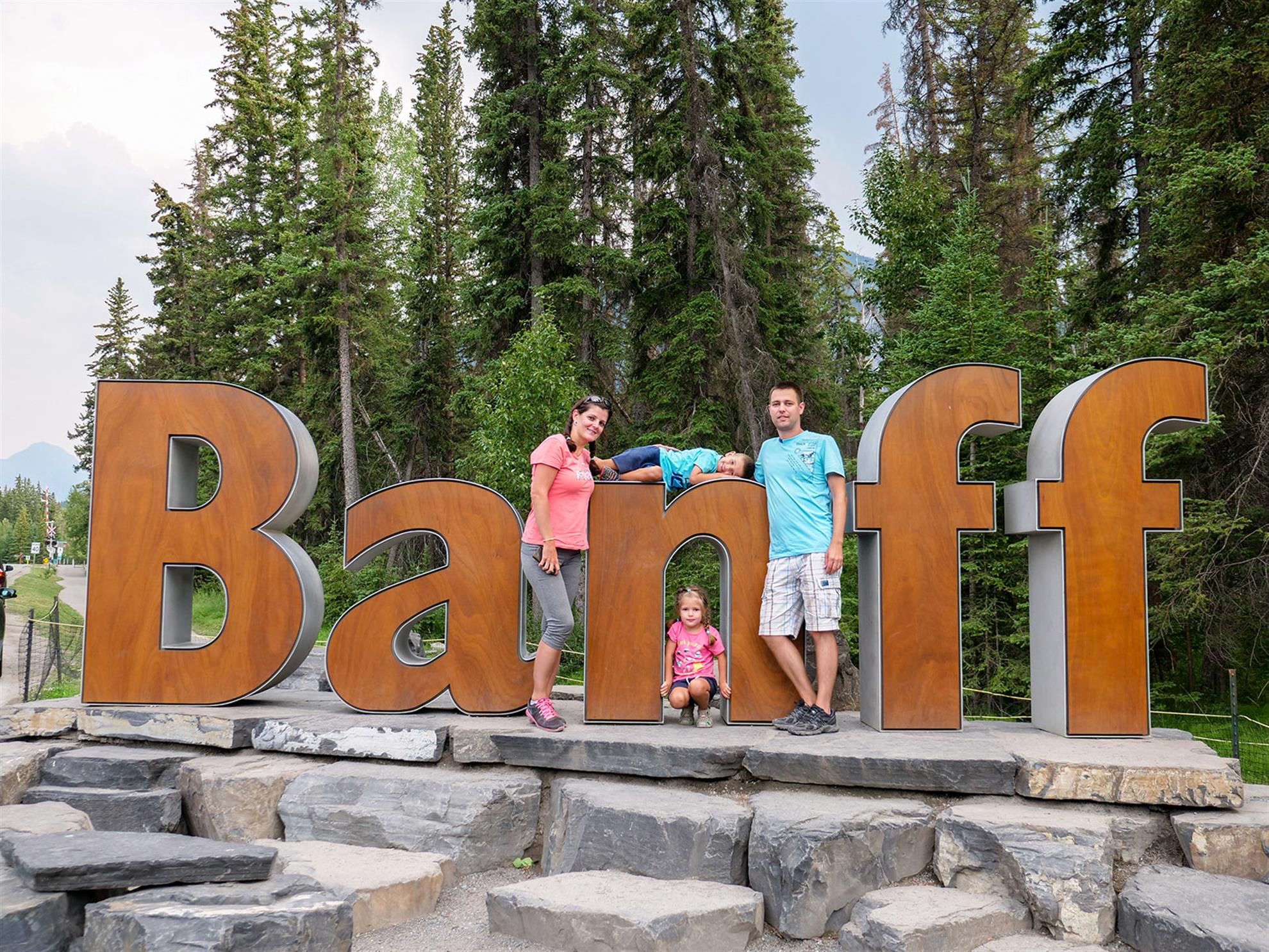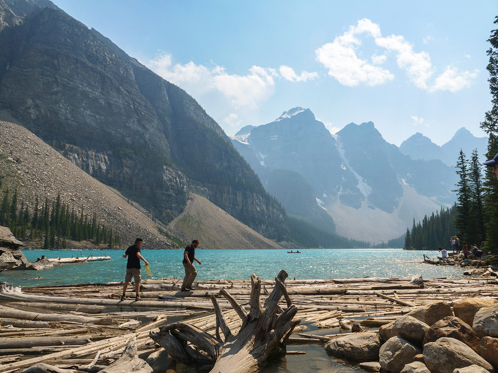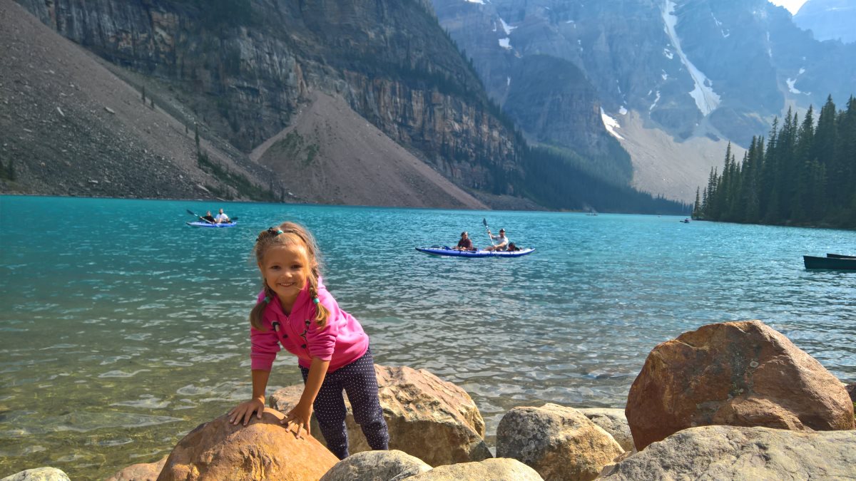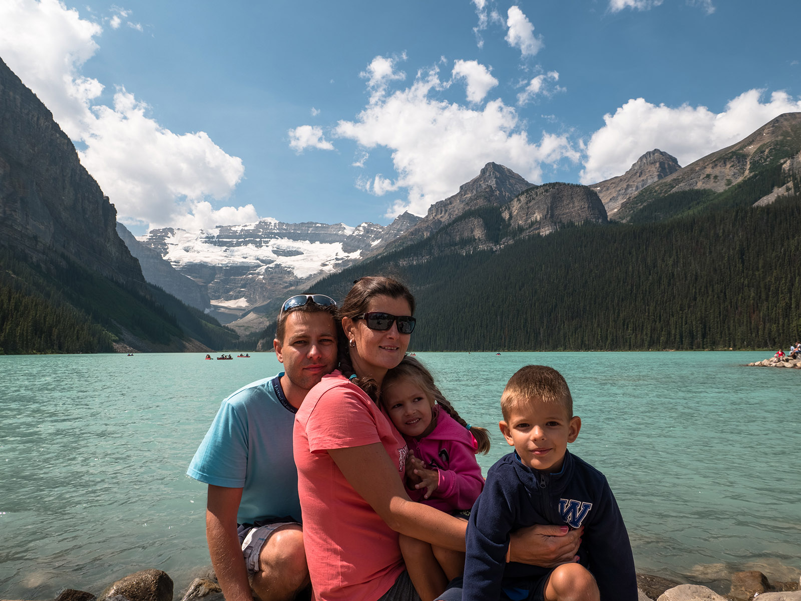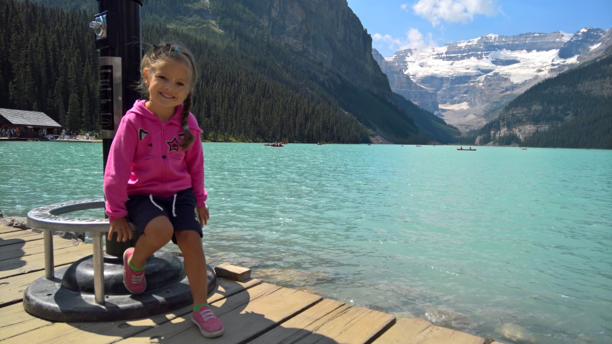 Dalším plánovaným jezerem bylo Moraine Lake. K tomuto jezeru jezdí autobusy také, ale v hlavní sezóně jsou zpoplatněny (cca. 50CAD za nás 4). Zkusili jsme tedy vlastním vozem, za pokus nic nedáme. Příjezdová cesta byla uzavřena a personál nám řekl, že je máme dobře sledovat a že čas od času pár aut pustí. Čekali jsme a po asi 15minutách jsme viděli, že závora je odsunutá a auta tam mohou. Využili jsme naši šanci a dojeli až k Moraine Lake. Cestou k jezeru Verunka usnula. Spala asi 20-25 min (pak jsme ji vzbudili, byli jsme už u jezera). Podívali jsme se na jezero, vylezli všichni na jednu menší skálu (zbytek skály, která vlastně zapříčinila vznik jezera). K této skále nebyl přístup, proto jsme (jako ostatní) využili kmeny stromů ve vodě. Mnoho lidí spadlo, my ne. Prošli jsme se kolem jezera (tam jsme potkali Čecha, který žije nedaleko Banff NP) a pak jsme se jeli podívat do města Banff (to jsme jenom projeli autem, i tak bylo moc hezké). Celý den bylo polojasno a asi 27°C. Po 18-té hodině začalo pršet, asi 3x pár minutové deště, které jsme vždy absolvovali v autě. Do hotelu v Calgary jsme se vrátili asi o půl 9. Spát jsme šli asi ve 23:00 (dopoledne jsme měli najeto už 2000 mil).
