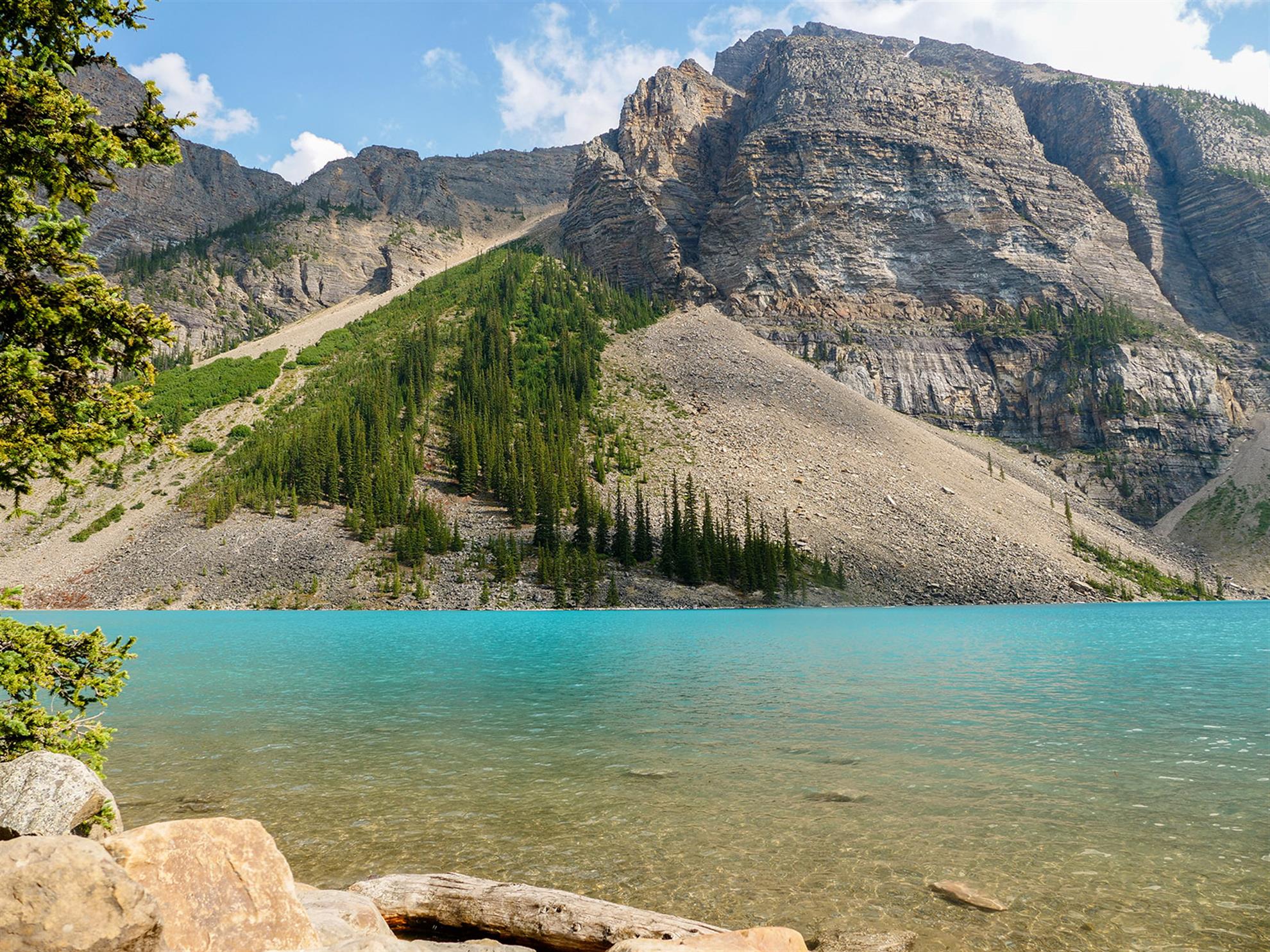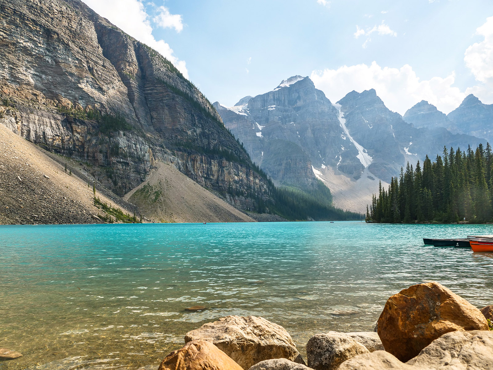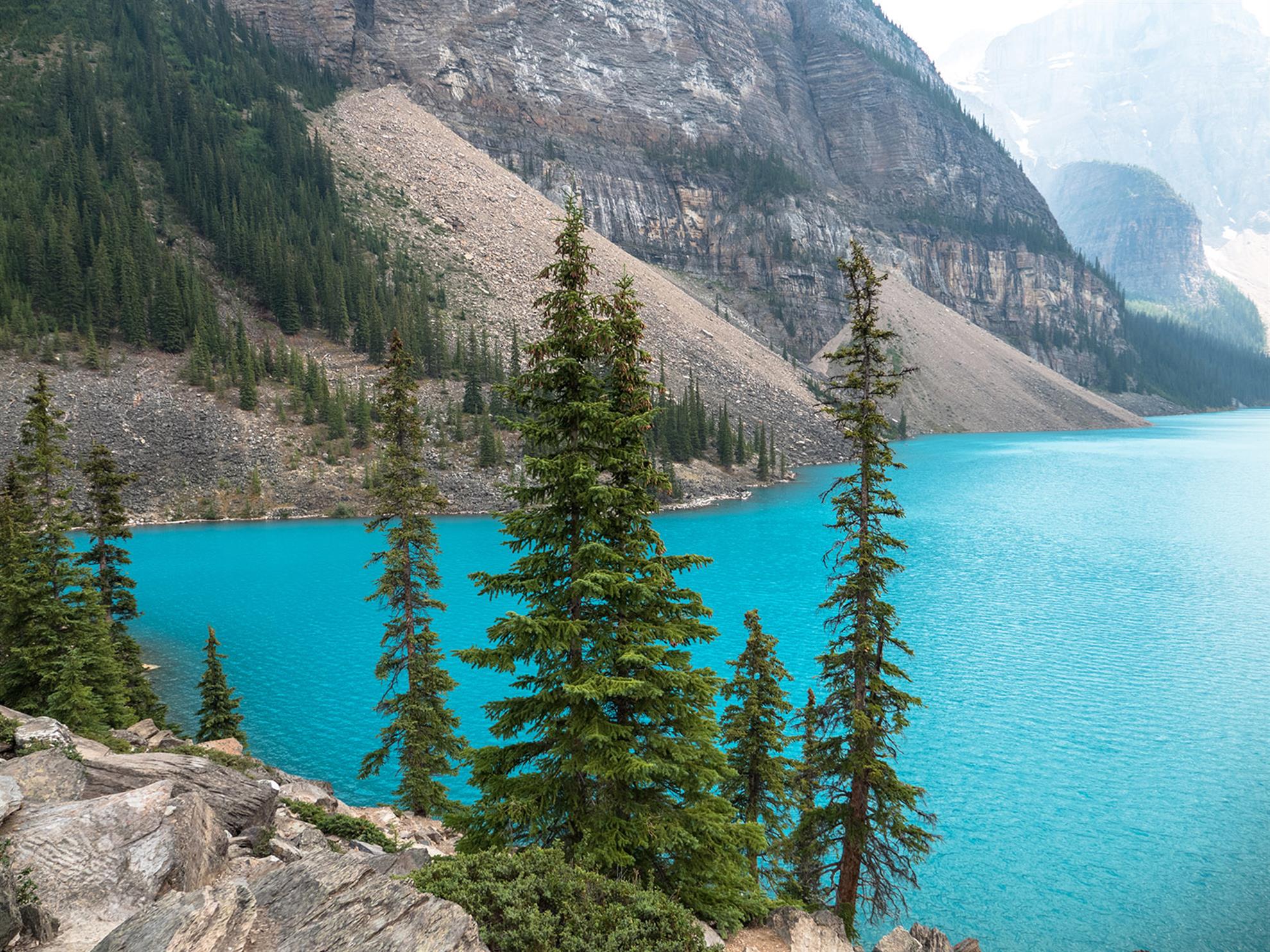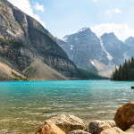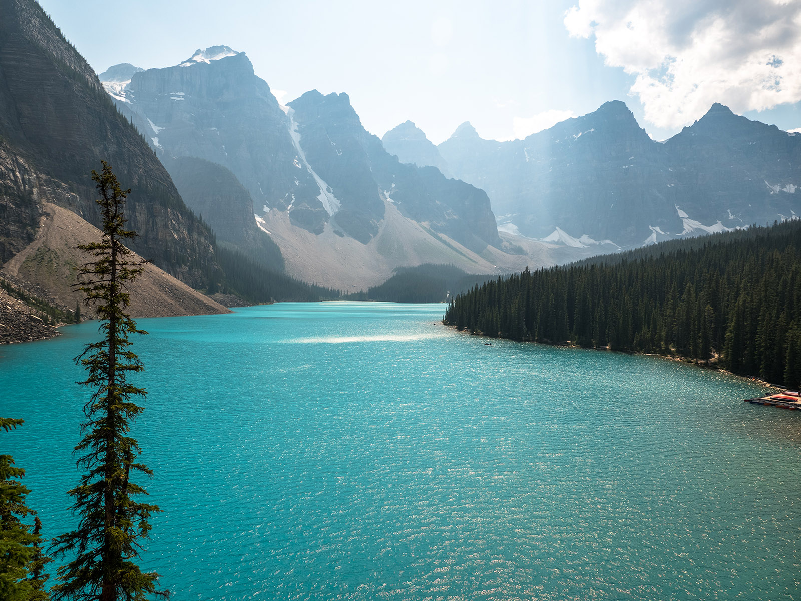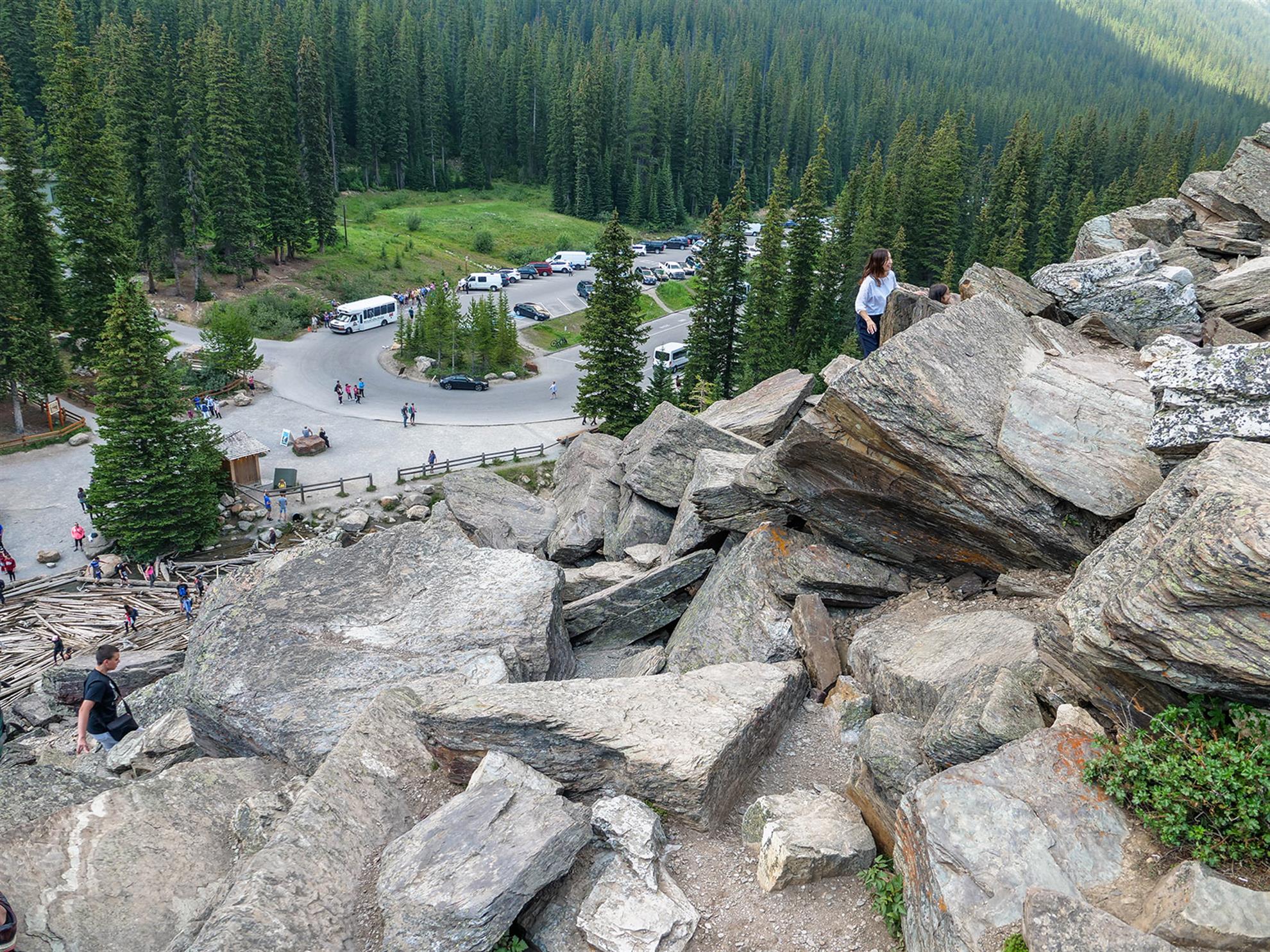 Dalším plánovaným jezerem bylo Moraine Lake. K tomuto jezeru jezdí autobusy také, ale v hlavní sezóně jsou zpoplatněny (cca. 50CAD za nás 4). Zkusili jsme tedy vlastním vozem, za pokus nic nedáme. Příjezdová cesta byla uzavřena a personál nám řekl, že je máme dobře sledovat a že čas od času pár aut pustí. Čekali jsme a po asi 15minutách jsme viděli, že závora je odsunutá a auta tam mohou. Využili jsme naši šanci a dojeli až k Moraine Lake. Cestou k jezeru Verunka usnula. Spala asi 20-25 min (pak jsme ji vzbudili, byli jsme už u jezera). Podívali jsme se na jezero, vylezli všichni na jednu menší skálu (zbytek skály, která vlastně zapříčinila vznik jezera). K této skále nebyl přístup, proto jsme (jako ostatní) využili kmeny stromů ve vodě. Mnoho lidí spadlo, my ne. Prošli jsme se kolem jezera (tam jsme potkali Čecha, který žije nedaleko Banff NP) a pak jsme se jeli podívat do města Banff (to jsme jenom projeli autem, i tak bylo moc hezké). Celý den bylo polojasno a asi 27°C. Po 18-té hodině začalo pršet, asi 3x pár minutové deště, které jsme vždy absolvovali v autě. Do hotelu v Calgary jsme se vrátili asi o půl 9. Spát jsme šli asi ve 23:00 (dopoledne jsme měli najeto už 2000 mil).