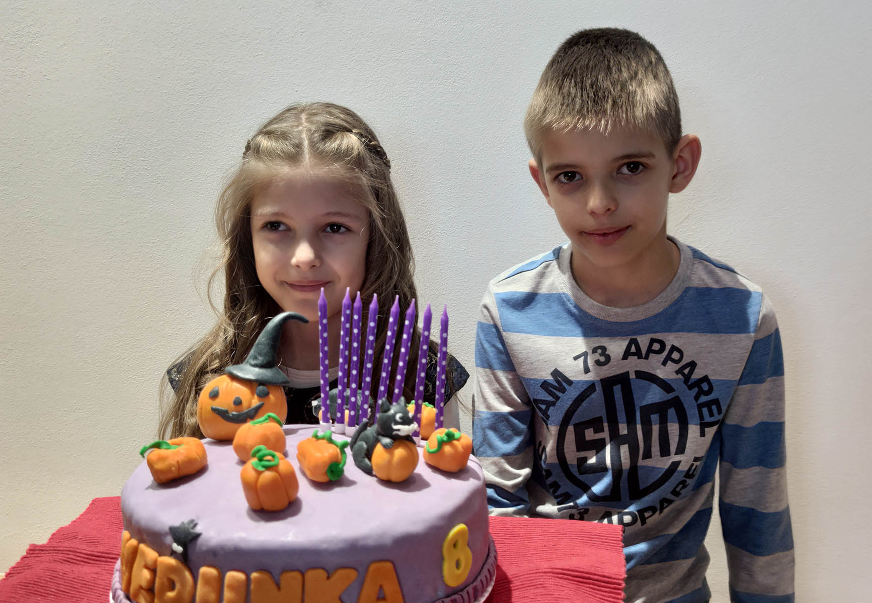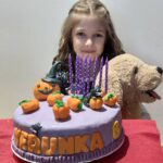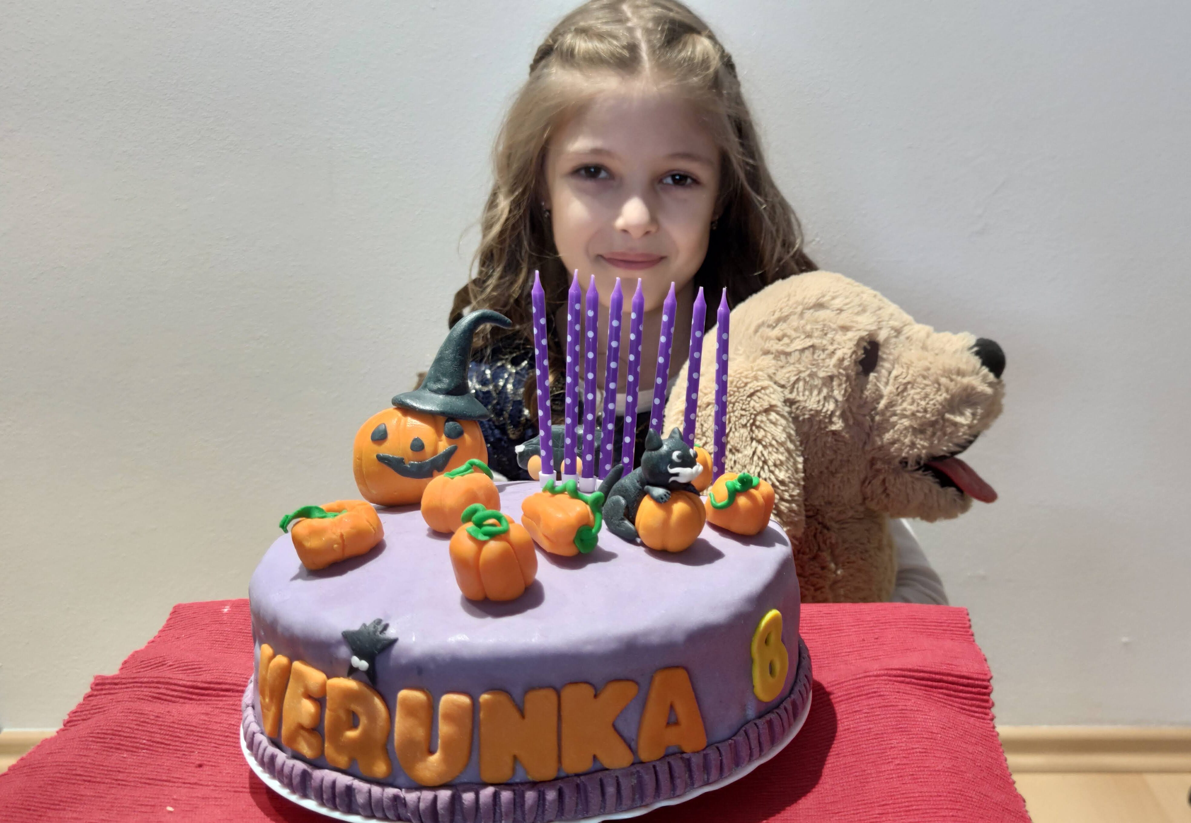 10.listopadu oslávila Verunka své 8 narozeniny. Váží 25,7 kg a měří 133 cm. Pro porovnání Kubík měl 22,9 kg a měřil 128,5 cm. Jelikož byl nedávno halloween, tak si Verunka přála narozeninový dort na téma halloween. Ale nesměl být strašidelný a měl být bez pavouků a pavučin. Tak snad se mi povedl.